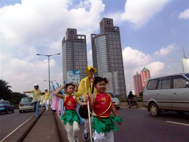 2005年棉兰印度尼西亚法轮大法游行 图为雄纠纠的腰鼓队为队伍开路