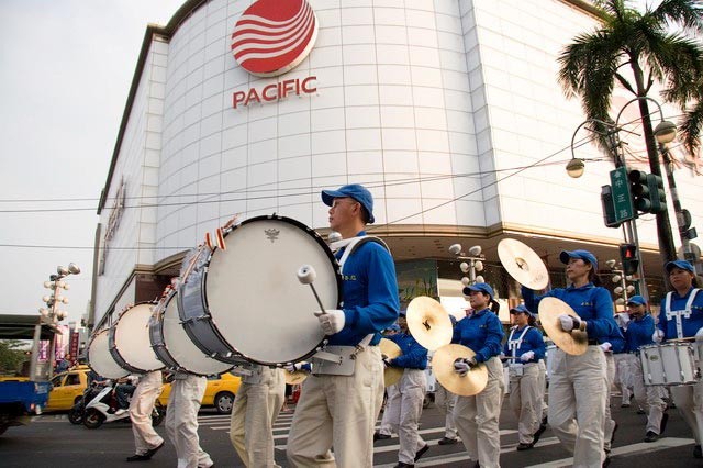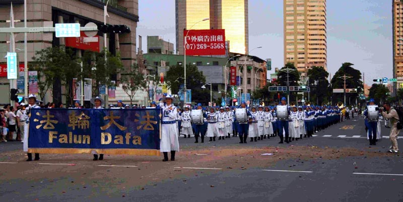 天国乐团参加高雄迎世运举办的游行,把法轮大法的美好,传送给民众2008-7-13