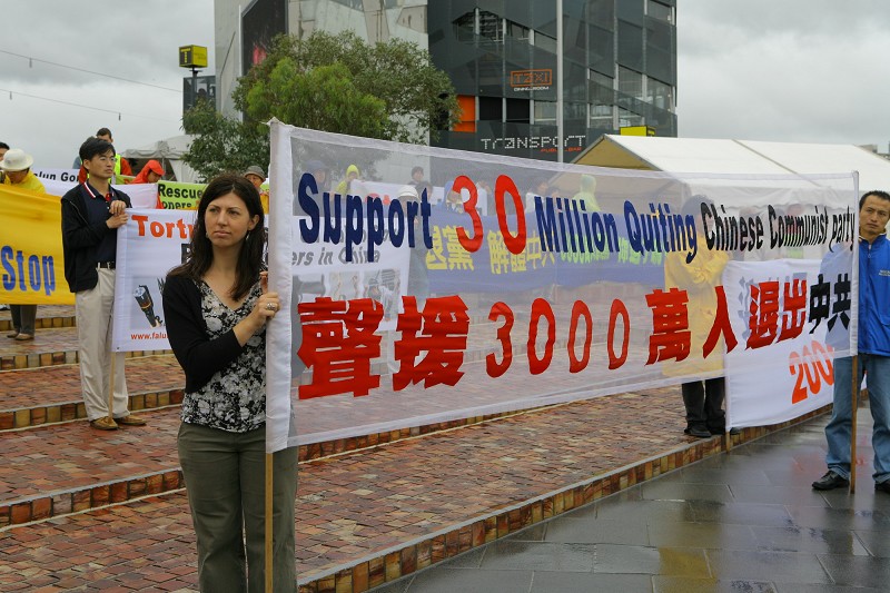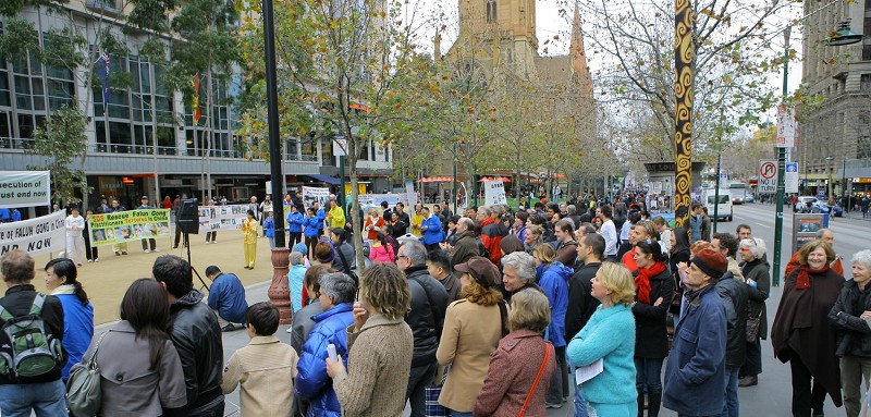 法轮功学员及墨尔本民众声援三千万三退举办集会游行图为吸引众多行人驻足观看2007-12-22