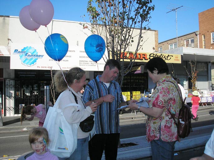 澳洲墨尔本学员在市中心游行,庆祝二零零八年世界法轮大法日,图为民众纷纷签名声援法轮功 2008-5-10
