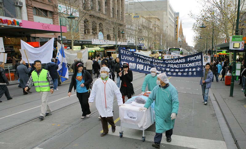 法轮功学员及墨尔本民众声援三千万三退举办集会游行图为队伍中的活摘器官谋暴利演示2007-12-22