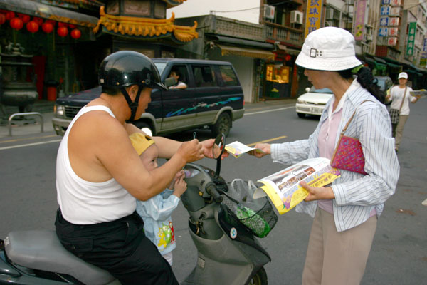 法轮功学员在高雄“声援四千万人退出中共”的大游行及烛光悼念会图为民众阅读真相资料2008-7-20