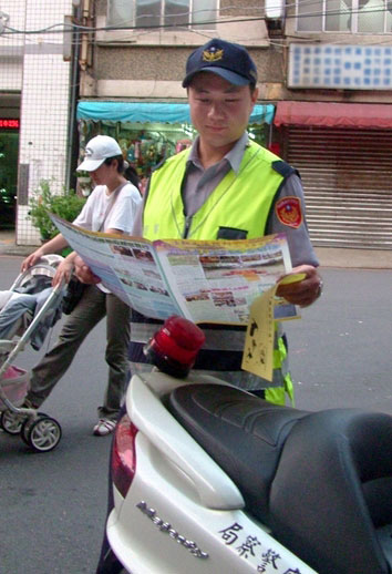 天国乐团”在台湾三芝乡艺文季受邀游行演出图为领队巡警了解真相2008-7-5