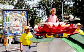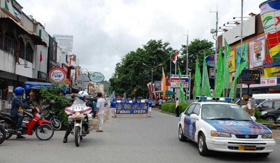 法轮功学员参加印尼国庆日和新亚拉佳市的建市游行,展现大法的祥和及美好2008-8-18