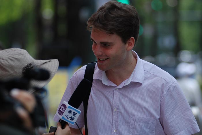 法轮功学员在日本东京Shinjuku和Okubo举行游行声援四千万退出中共图为路人接受采访2008-8-17