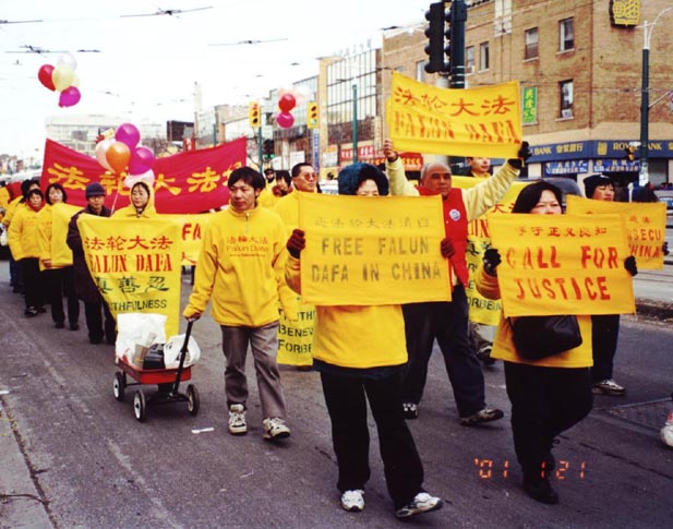 新春佳节到来之际,加拿大多伦多法轮大法学员和支持者在唐人街游行,呼吁中国江泽民之流立即停止对法轮功学员的残暴镇压