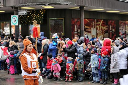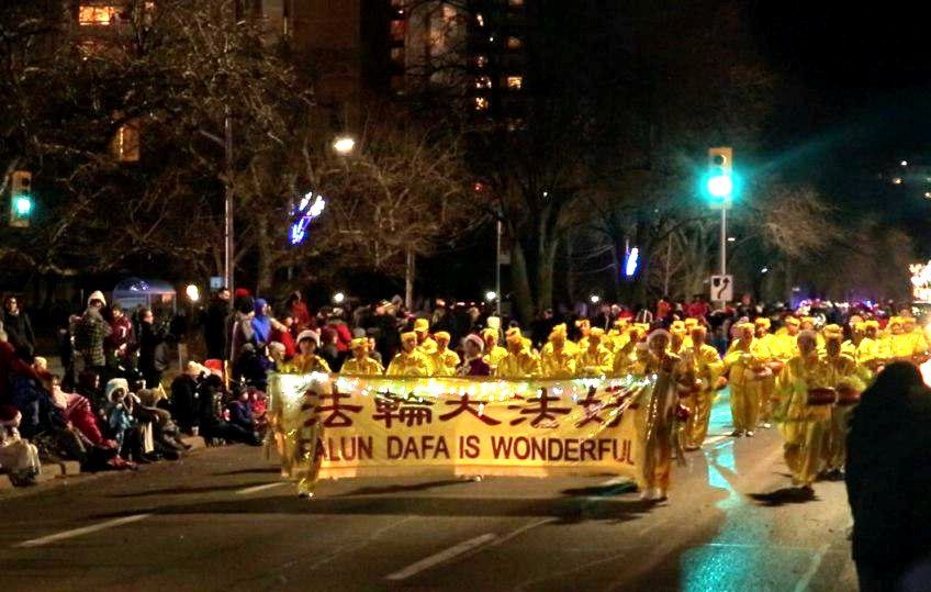 法轮功团体受邀参加蒙特利尔圣诞游行,声势浩大,阵容壮观,受瞩目