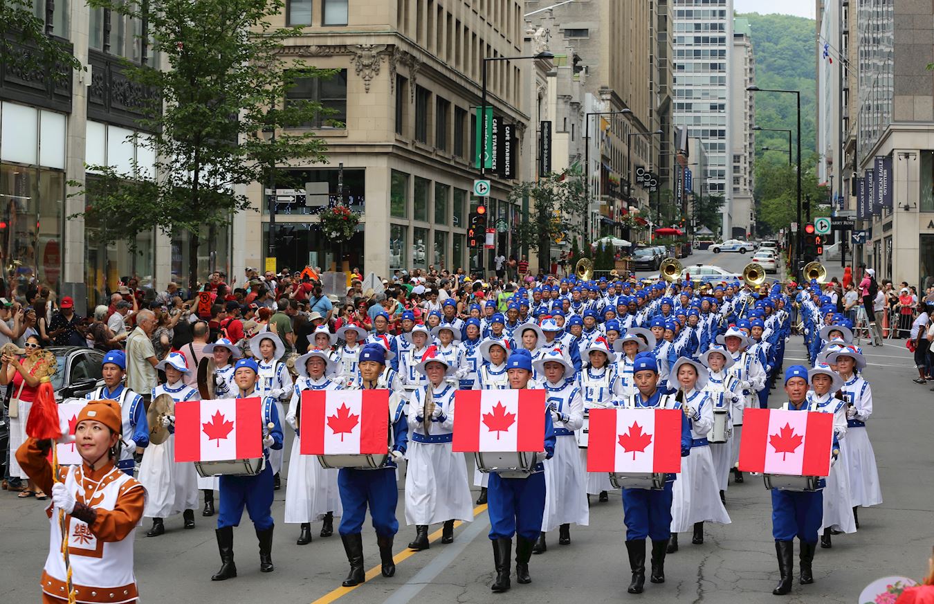 法轮功学员应邀参加蒙特利尔举办的加拿大国庆游行,东、西方观众盛赞法轮功