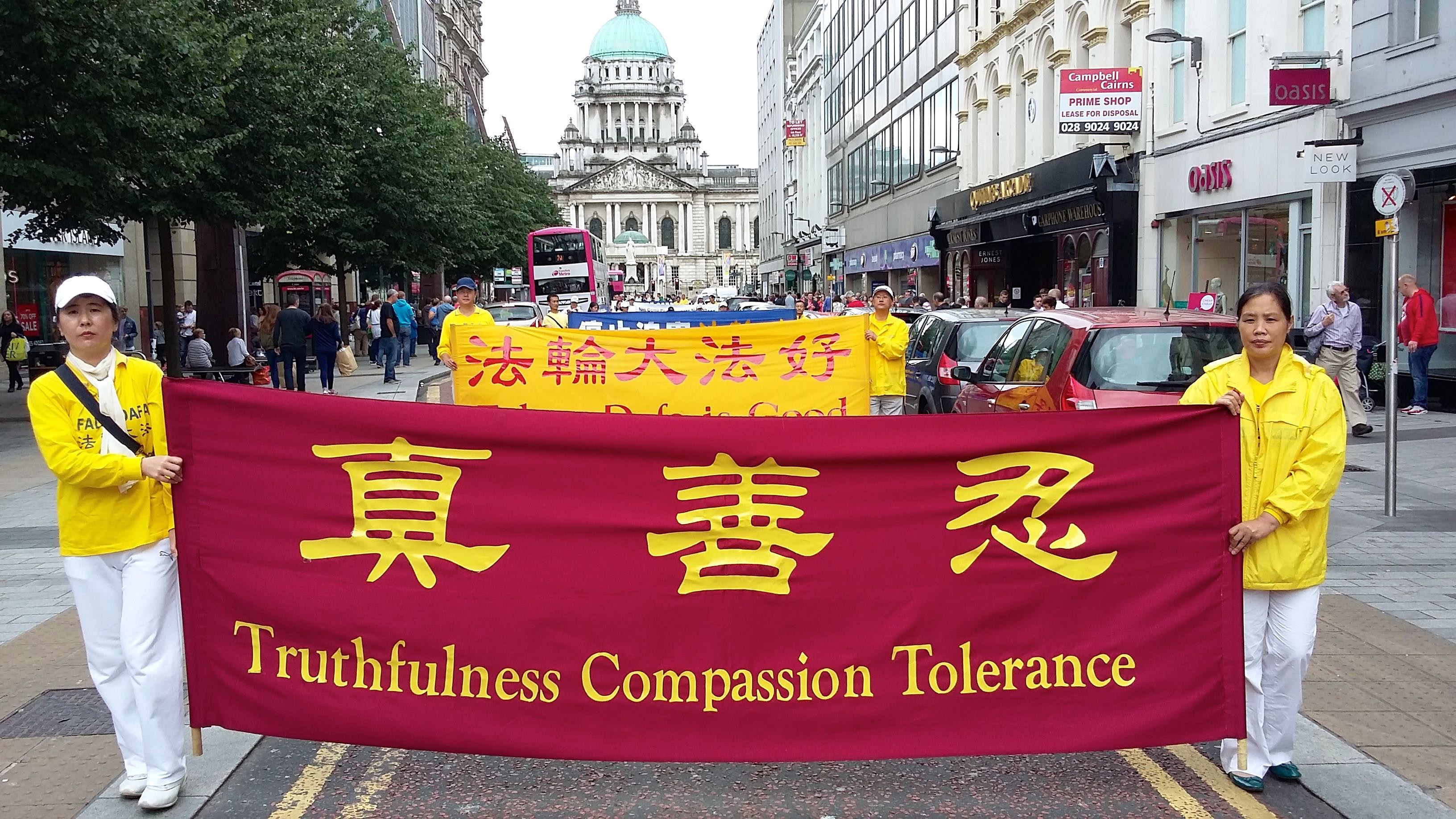 法轮功学员在Belfast市中心举行游行集会,讲真相等活动民众签名支持反迫害