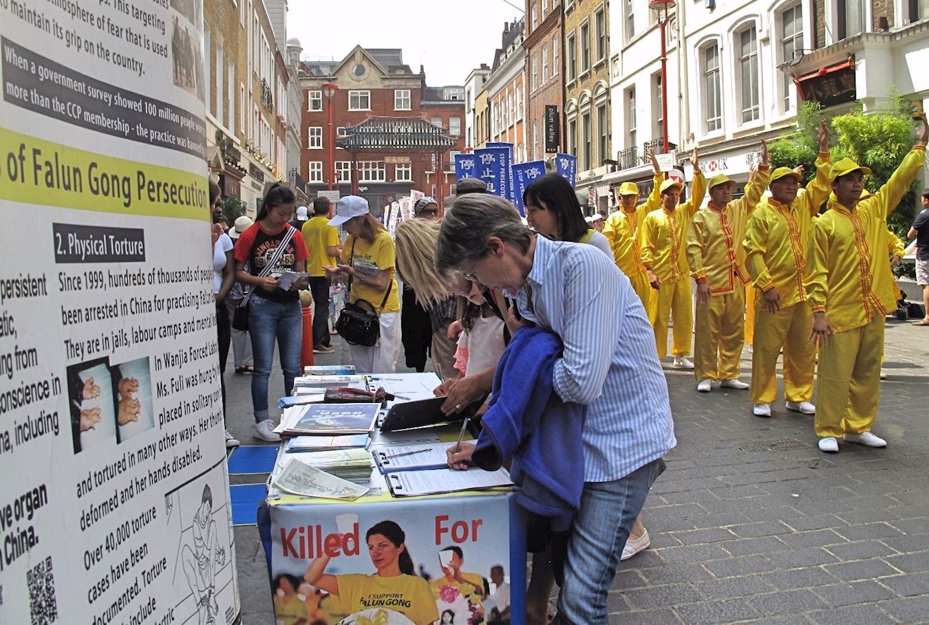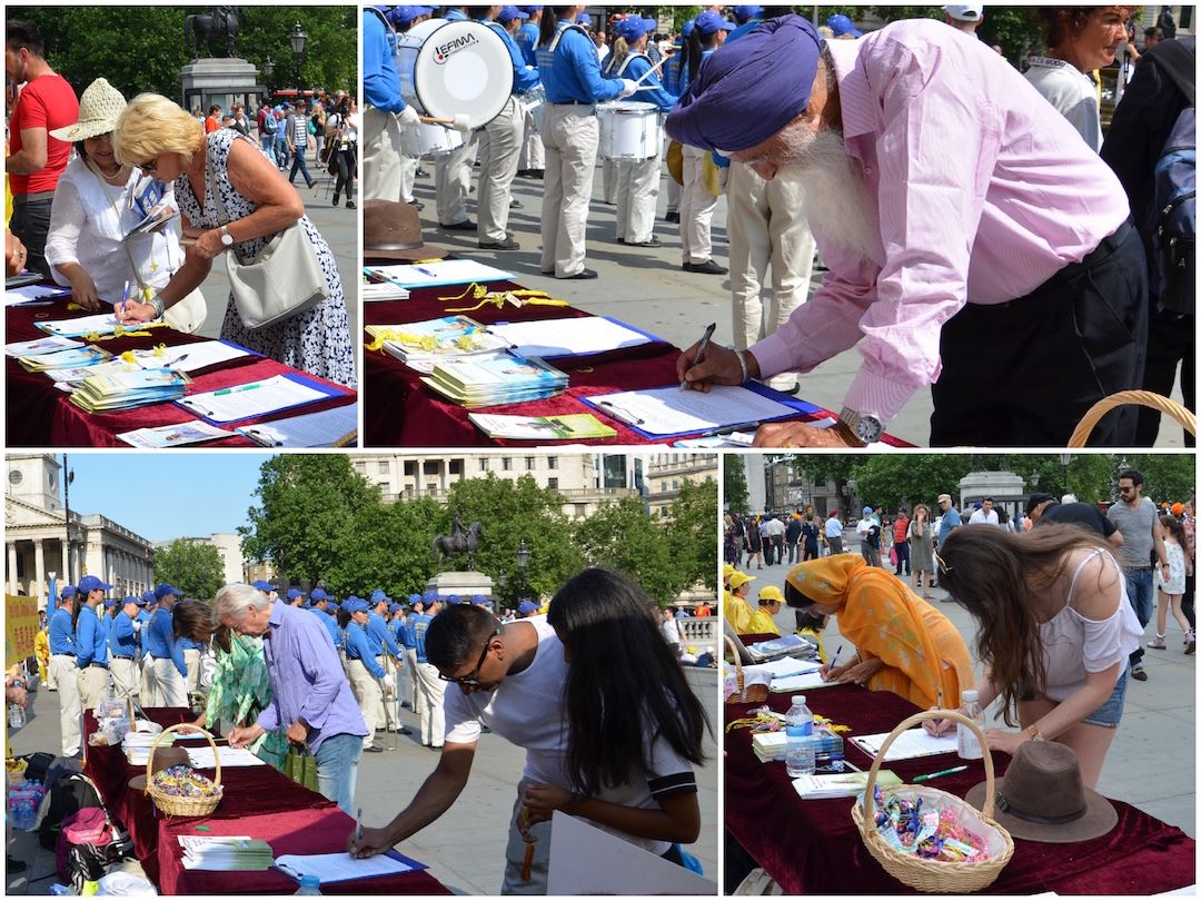 纪念法轮功反迫害十八周年,在伦敦举行集会,游行 图为签名支持的民众
