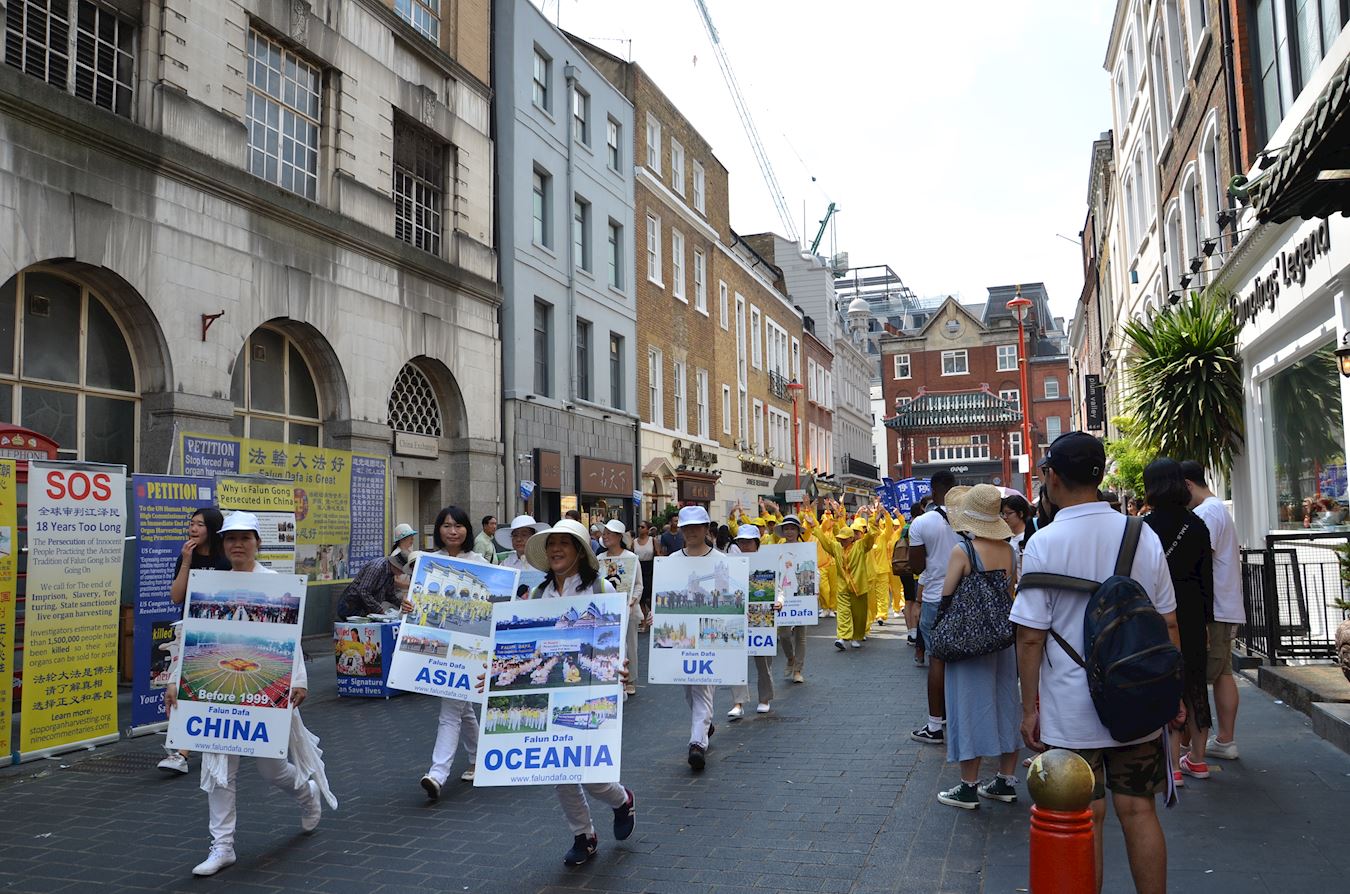 纪念法轮功反迫害十八周年,在伦敦举行集会,游行