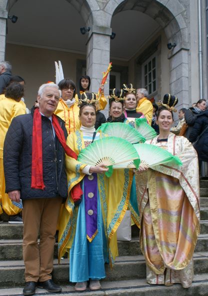 法轮功学员参加法国库唐斯市的中国年庆祝游行,受到了观众们的欢迎。