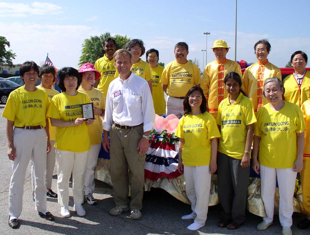 美国圣路易法轮功学员参加鲍尔温日大游行获奖 图为国会议员Akin先生和学员合影 2007-6-23