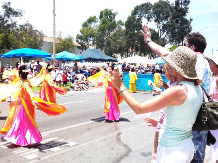 法轮功学员参加加州杭亭顿海美国独立日游行图为传统中国优美仙女舞蹈表演2007-7-4