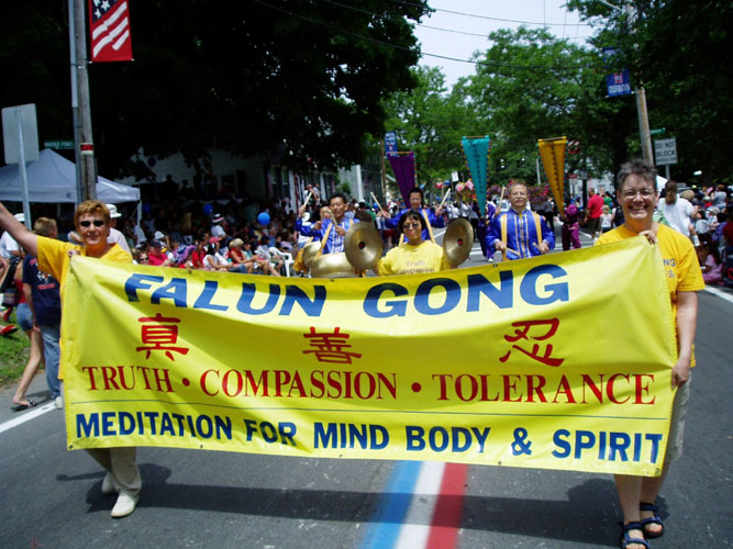 法轮功学员参加大科州丹佛哥瑞理镇的立日大游行图为祥和美好的法抡功队伍2007-7-4