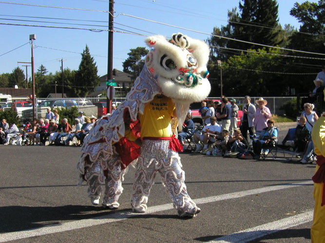 美国华盛顿州法轮功学员参加蒲门市滨豆节游行 连续第三年获奖 图为学员表演的中国狮舞2006-8-19
