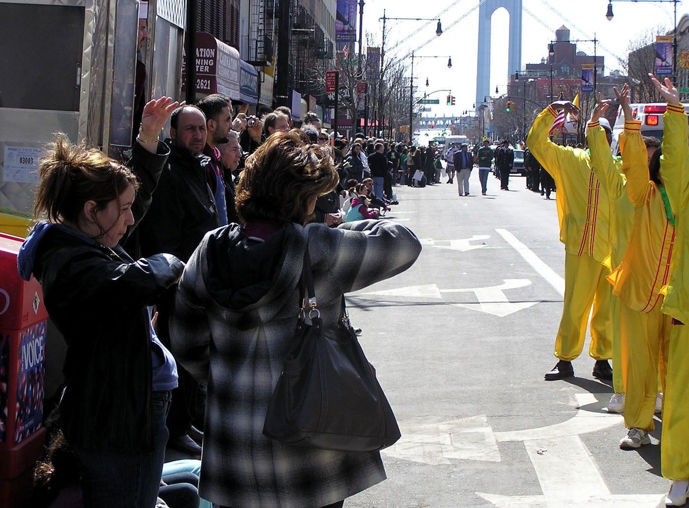 法轮功学员参加新泽西圣派翠节游行,美丽的队伍所到之处都迎来热烈的掌声