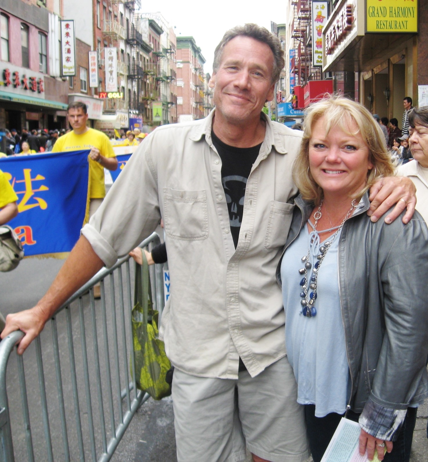 圣地亚哥建筑师凯莉与男友雷在观看曼哈顿法轮功大游行