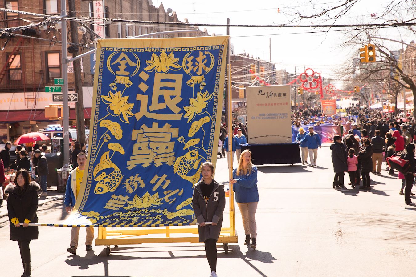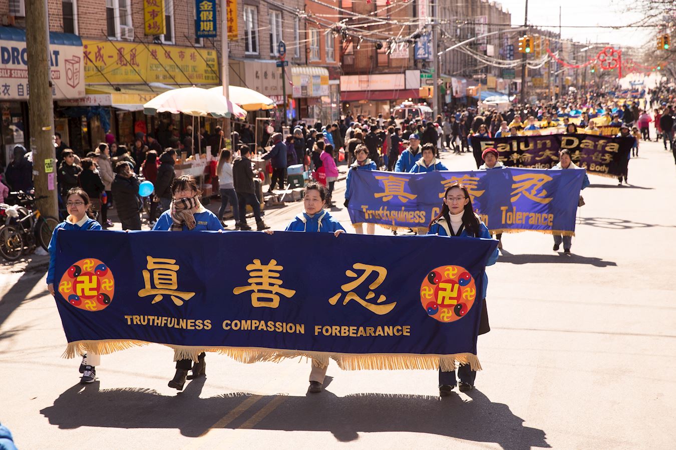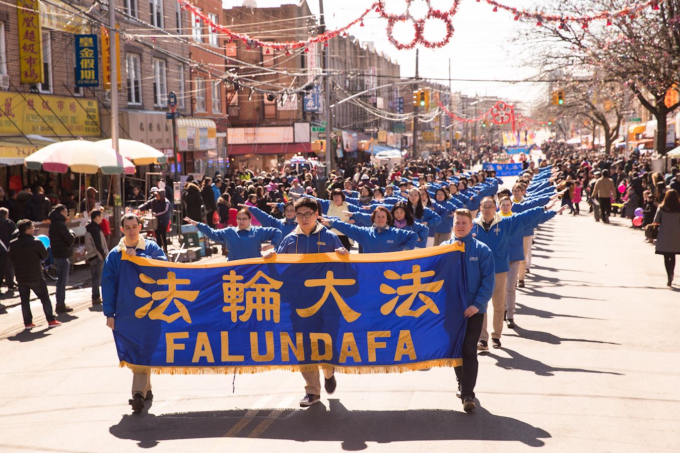 法轮功学员参加法拉盛中国新年大游行,给民众拜年、送福