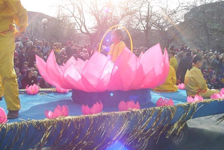美丽的法轮大法莲花灯车吸引了众多观看游行的人
