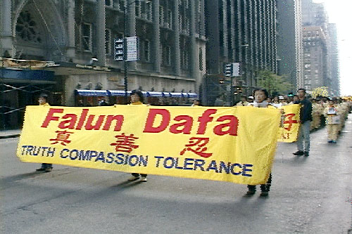 数千法轮功学员在江XX到达芝加哥时举行抗议游行