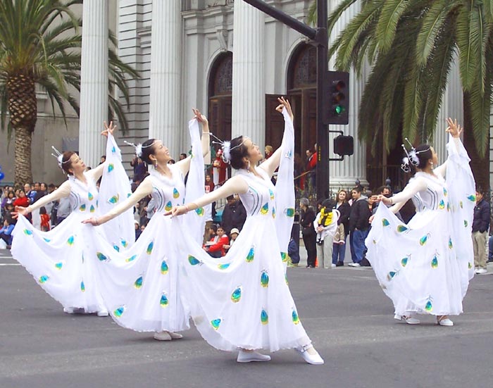 北加州学员应邀参加圣荷西市新年游行再获好评 图为典雅靓丽的孔雀舞蹈