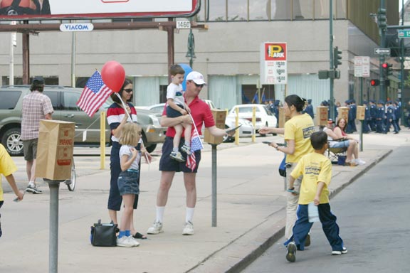 圣路易法轮功学员参加韦伯思特国庆日游行 图为发放法轮大法传单