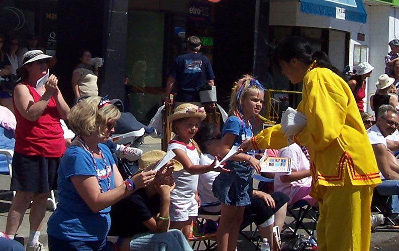 加州圣地亚哥法轮功学员参加海边市独立日游行 沿途观众纷纷向发放大法简介的学员索要材料