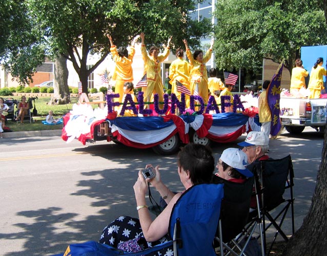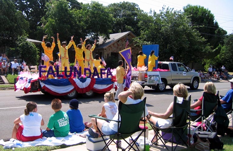 达拉斯法轮功学员参加德州最大的独立日游行 图为法轮功学员的队伍吸引了媒体