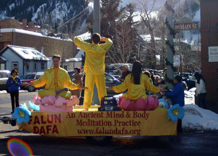 美国科罗拉多州法轮功学员参加了艾斯本冬日节(Aspen Winter Festival)游行 受到民众的欢迎2006-1-14