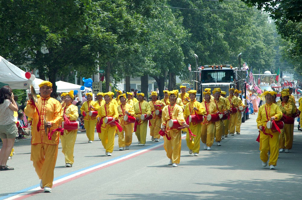 法轮功学员参加费城的美国独立节庆祝游行,图为上百人的法轮功天国乐团2006-7-4