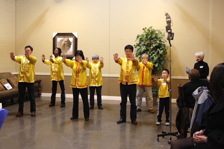 法轮功学员在麻州昆市中国新年联欢会上示范功法