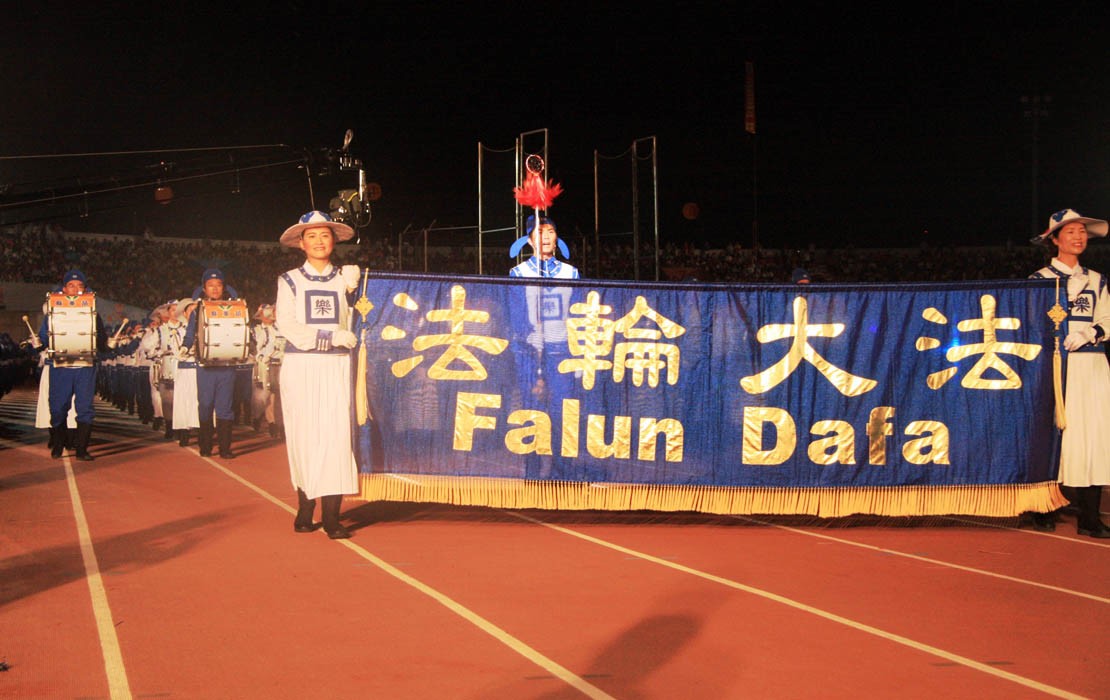 法轮功学员参加稻泽市庆祝活动,在舞台上展示功法,让人大开眼界