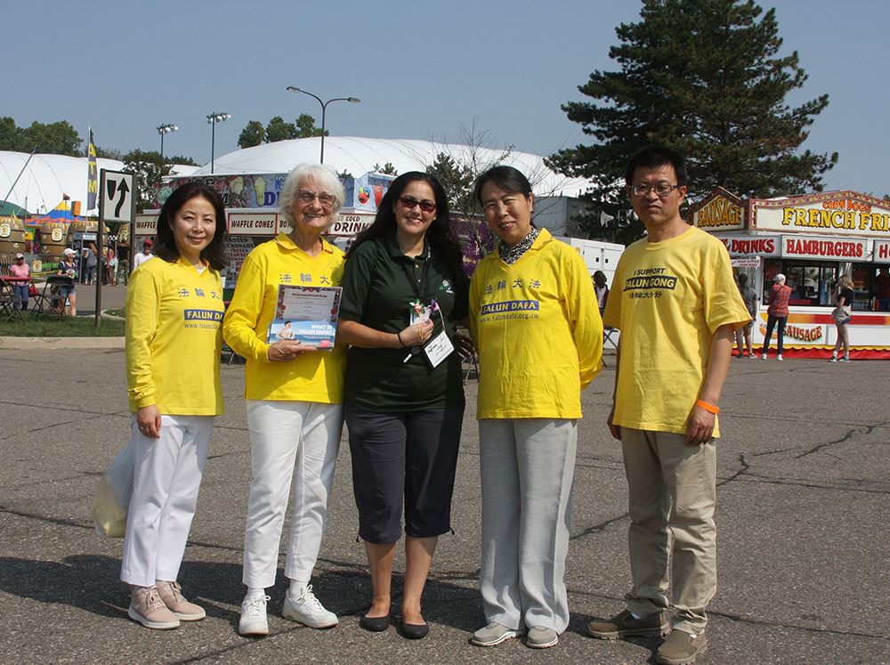 台湾灯会,学员展现修炼的美好图为县长和副县长与法轮功学员合影