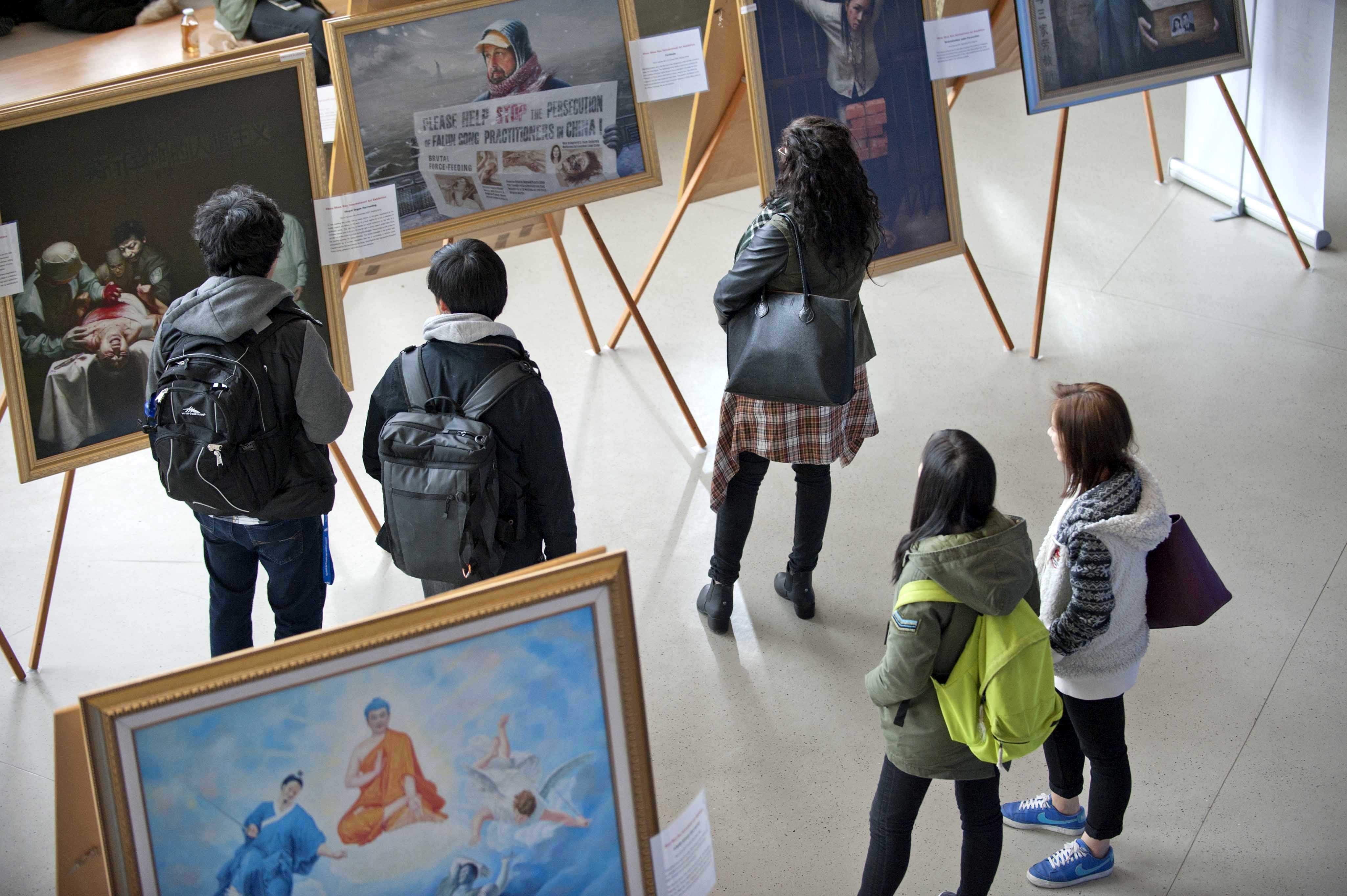 真善忍美展在阿伯达大学学生会大楼举办,感动观看画展的师生们