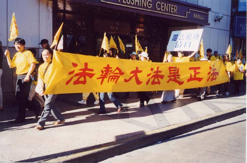 世界日报 2000.7报道法轮功大游行悼死者散传单逾千人在曼哈坦请愿早晨练功、中午上街头五十名前导着白衣持遗照路人动容