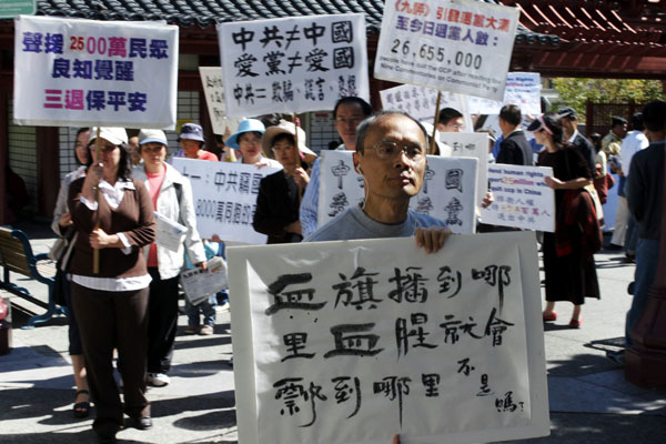 旧金山湾区各界人士在华埠花园角举行“中华国殇日”集会图为北加州退党服务中心代表发言2007-9-30