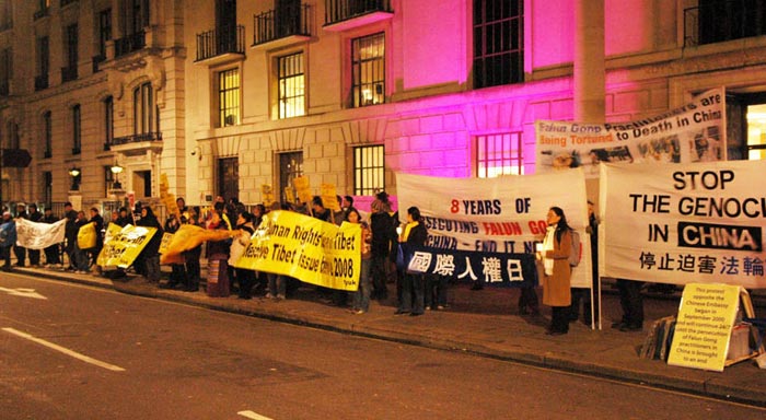 法轮功学员于“世界人权日”在伦敦中使馆前集会呼吁制止中共对法轮功的迫害。2007-12-10