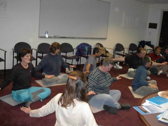 法轮功学员应邀瑞典Lidköping市的健康组织协会举办研讨会图为研讨会上,人们学炼功法