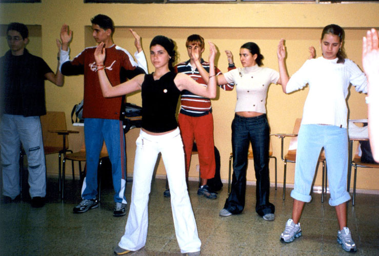 法轮功学员在西班牙加纳利岛向公众介绍法轮功,并教授功法