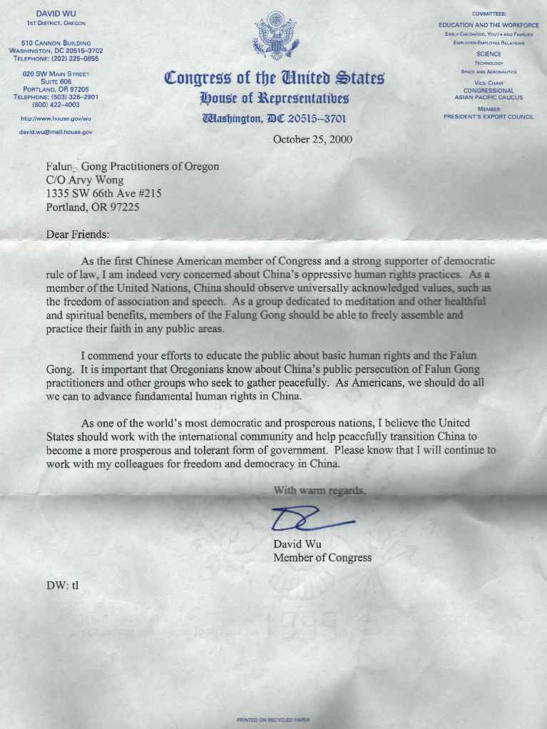 美国俄勒岗的波特兰市的一次法轮功真相研讨会,图为国会议员吴振伟的来函