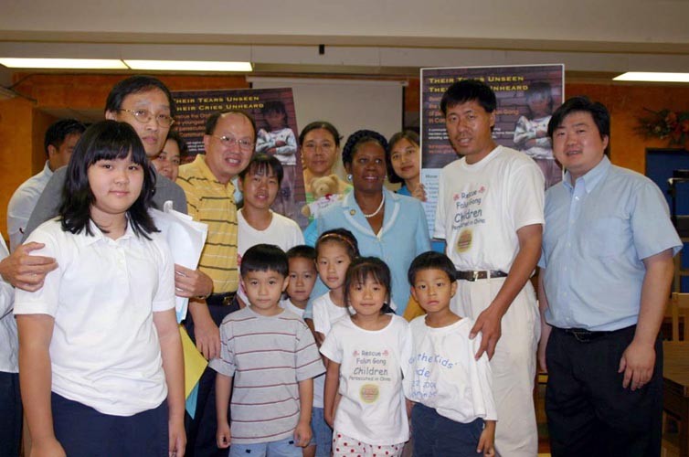“营救孤儿”汽车之旅图为学员向议员Sheila Jackson Lee介绍学员被迫害的情况
