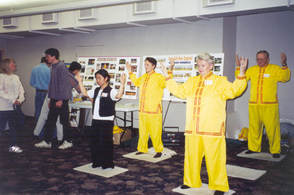 大受欢迎的台湾北港镇教师法轮功研习营,图为教师们正在学炼功法