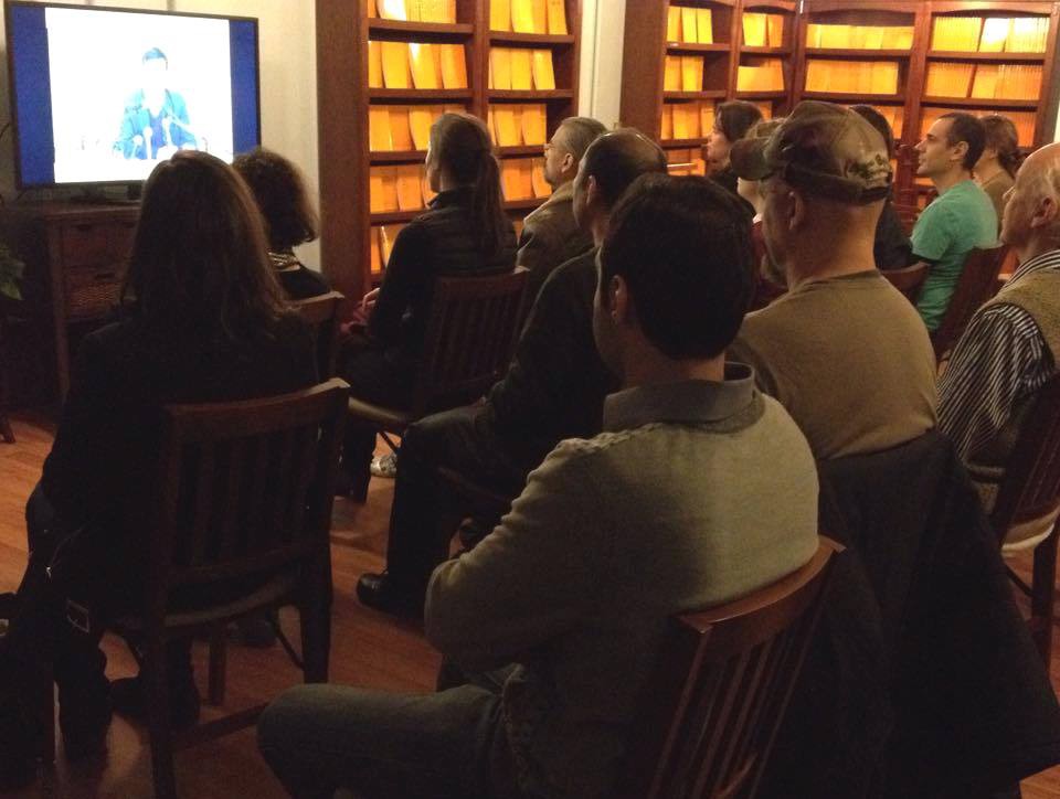 参加九天班的学员们通过讲课录像倾听李洪志师父讲法