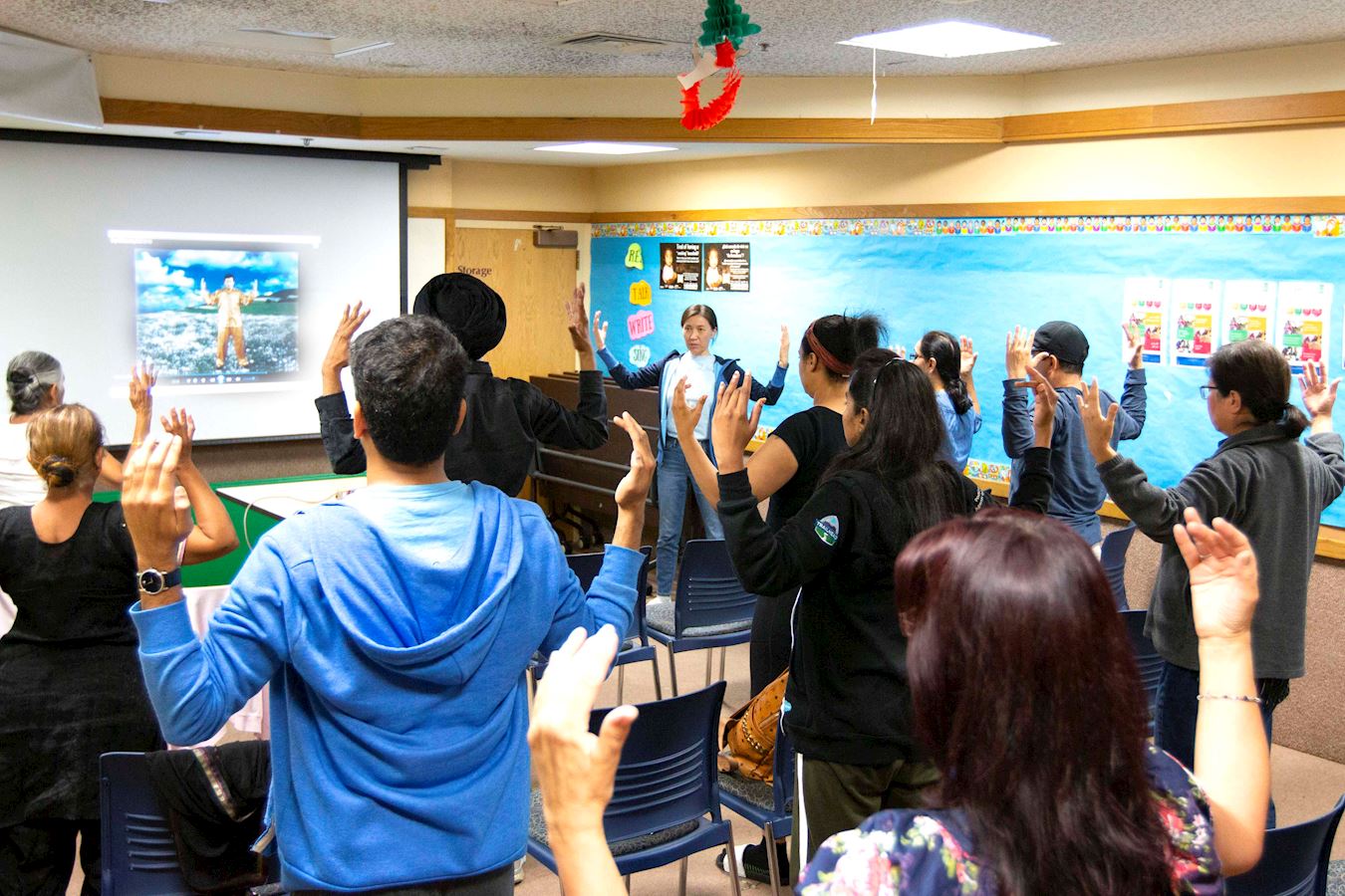 法轮功学员在Enfield社区中心举办免费义务教功活动。
