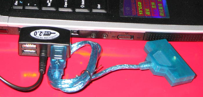 尝试用笔记本带多台刻录机、打印机 图为USB转IDE接口设备数据线(含电源)