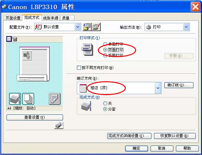 双面打印时正反面方向颠倒或页边距对不齐的问题图为佳能激光机的设置