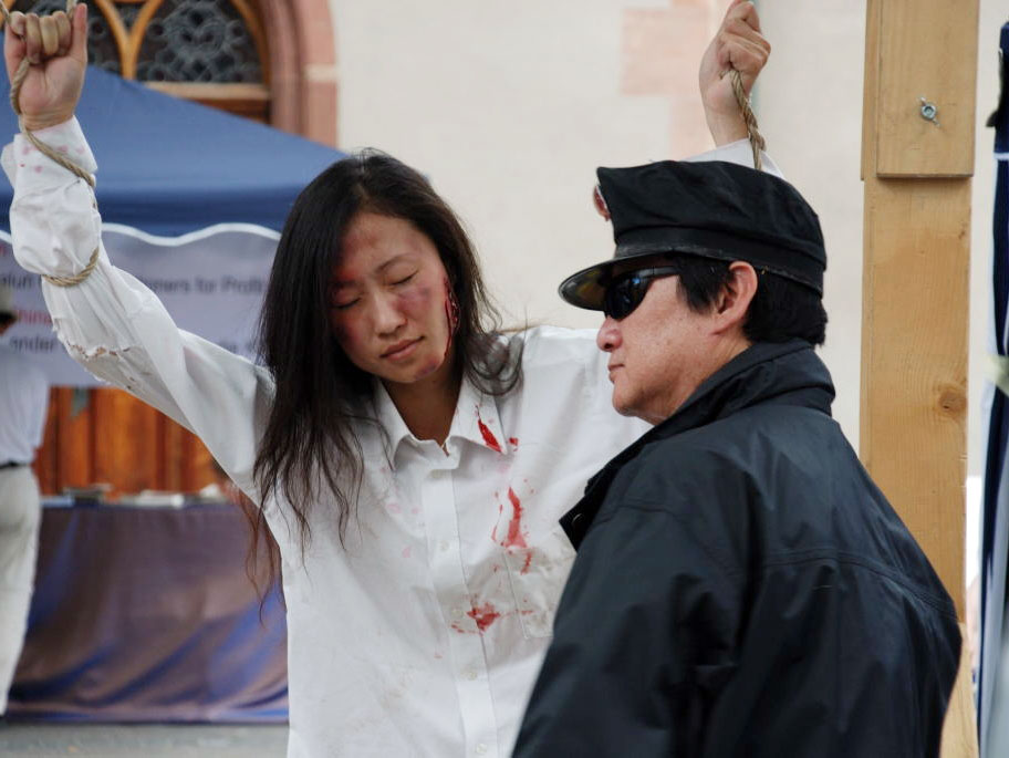 法轮功学员在瑞士巴塞尔的Clara广场上举办模拟酷刑展图为模拟中共施以酷刑