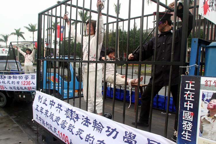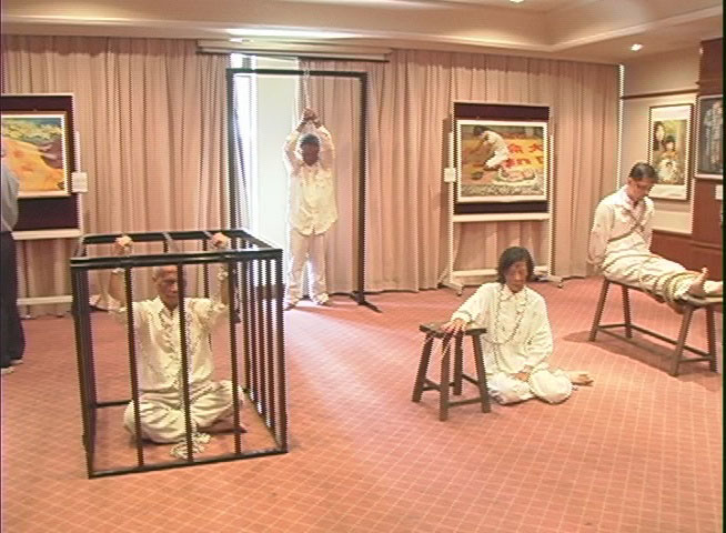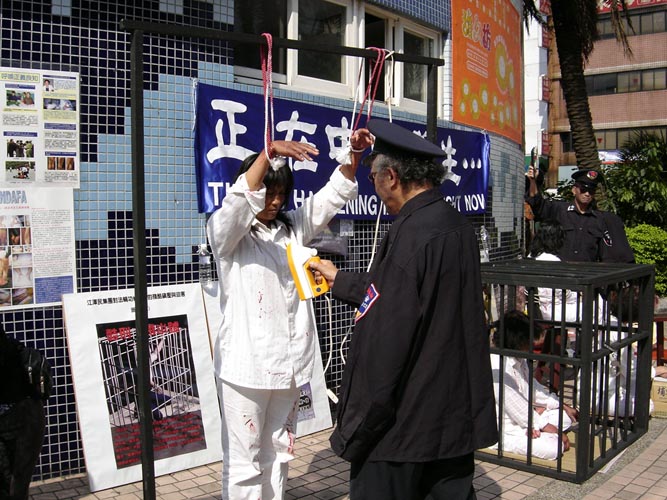 台湾法轮功学员南投举办反酷刑展 图为真人模拟酷刑展示