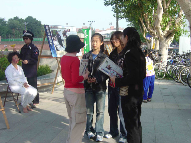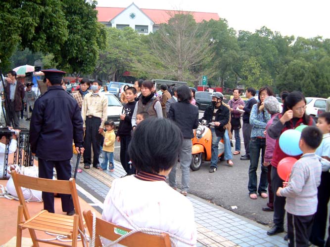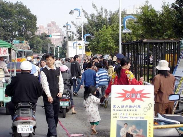 台湾基隆市法轮功学员在市中心爱三路公车循环站举行反酷刑展示活动讲真相 图为反酷刑展现场